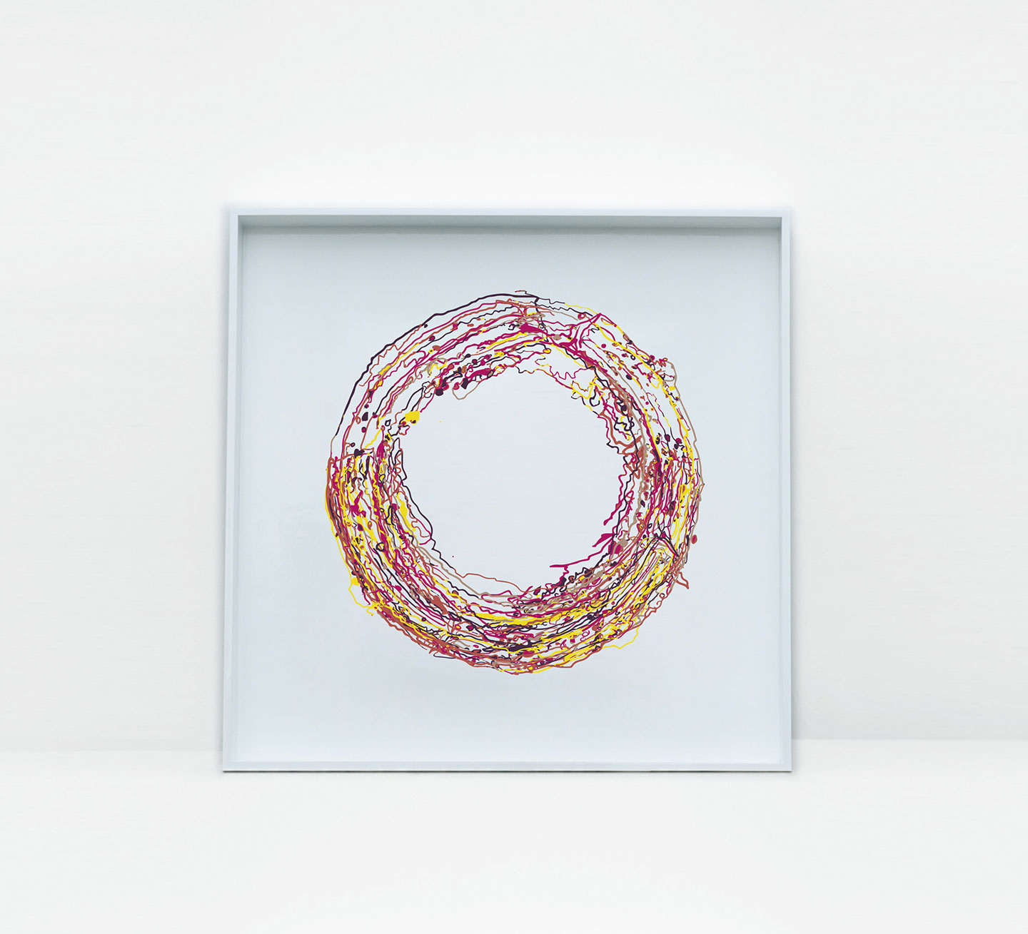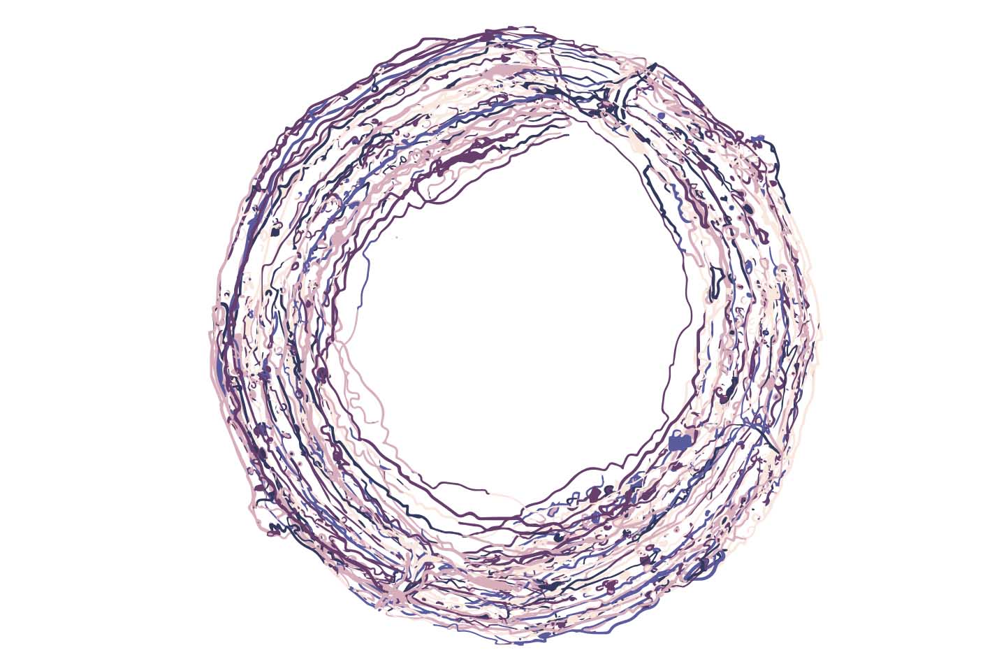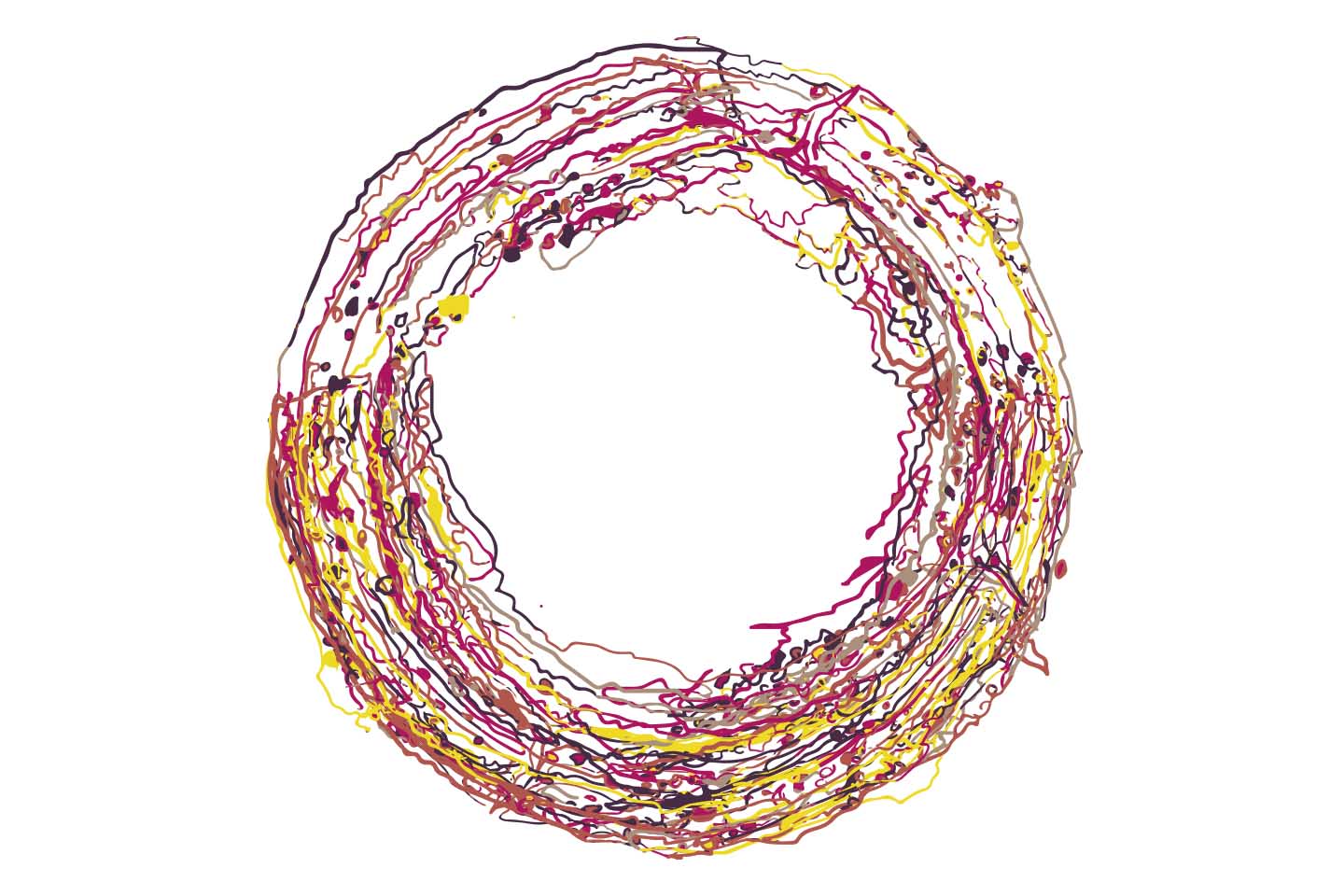 I'd left some Acrylic Paint in a my mixing palette and as it dried it left circular rings and contours that looked like a planet surface. After photographing the palette, I drew 10 vector SVG's and added them as assets in Processing/HYPE. By adding them randomly to the screen and setting a random rotation each time, it generate a unique piece of art each time.