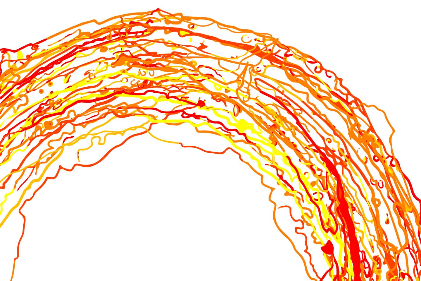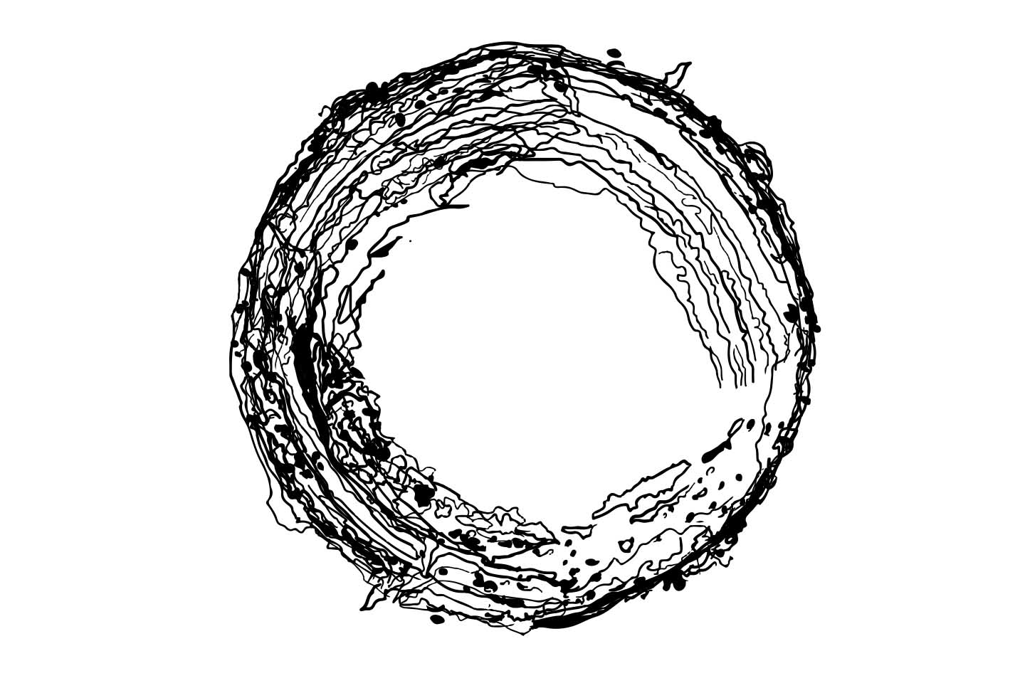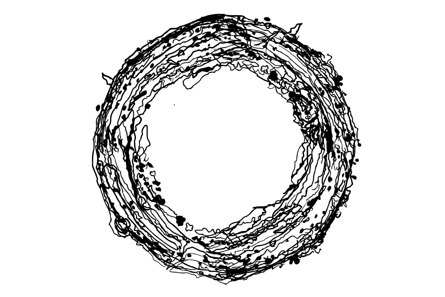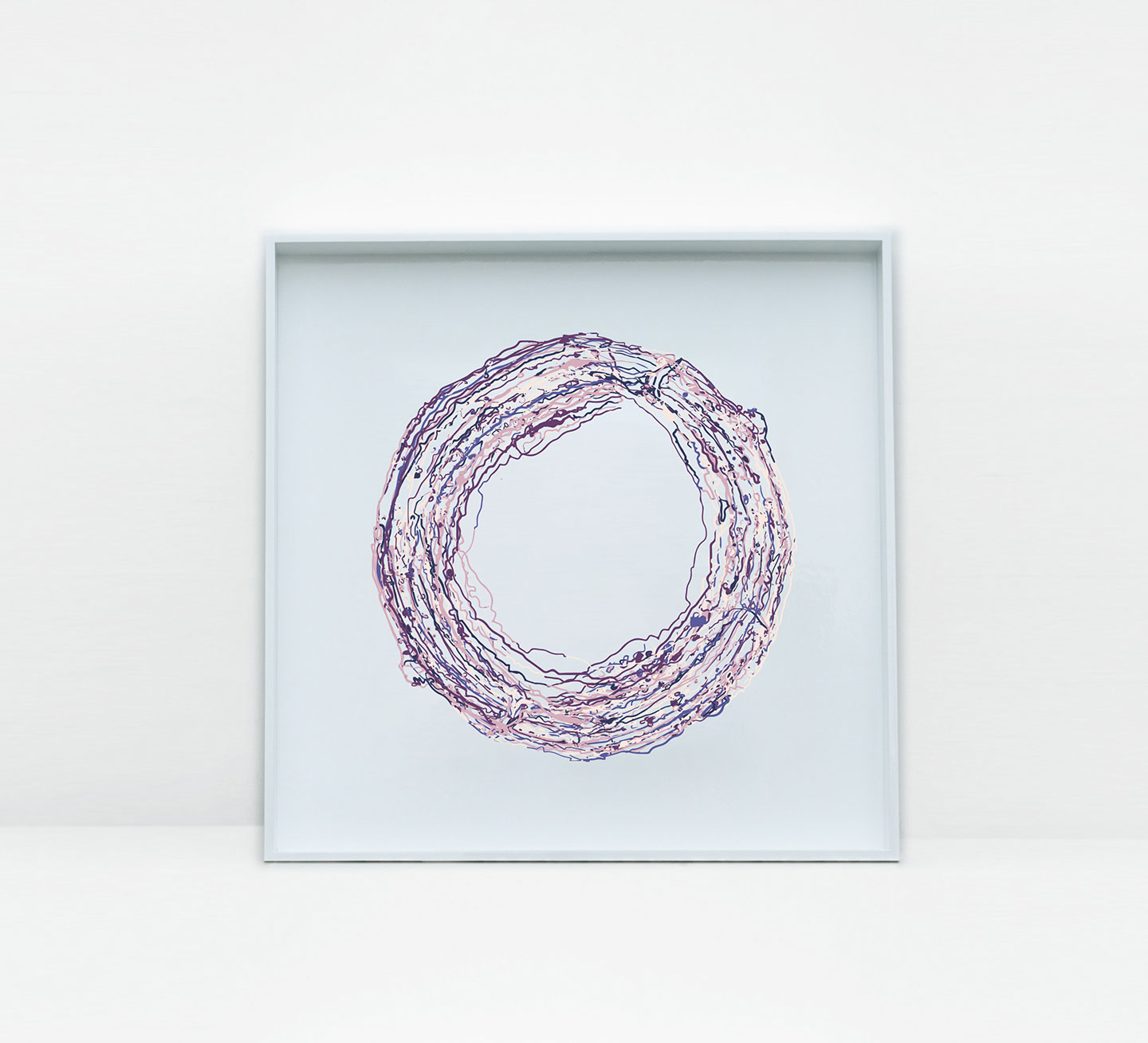 I'd left some Acrylic Paint in a my mixing palette and as it dried it left circular rings and contours that looked like a planet surface. After photographing the palette, I drew 10 vector SVG's and added them as assets in Processing/HYPE. By adding them randomly to the screen and setting a random rotation each time, it generate a unique piece of art each time.